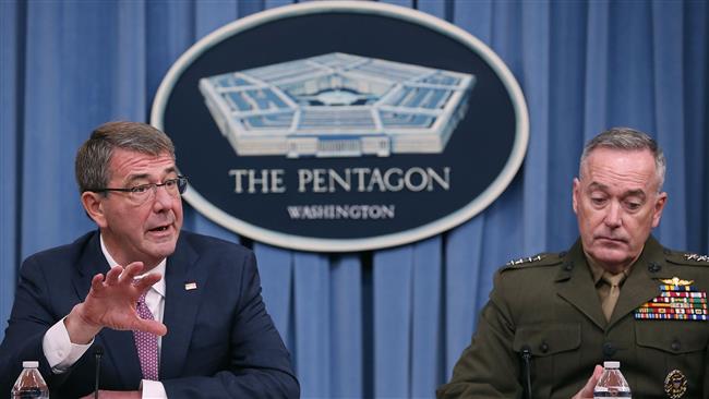 | Bộ trưởng Quốc phòng Mỹ Ash Carter (trái) và Tổng tham mưu trưởng liên quân Hoa Kỳ Joe Dunford trong phòng họp báo của Lầu Năm Góc, ngày 29/2/2016 tại Arlington, Virginia. Ảnh: AFP. |