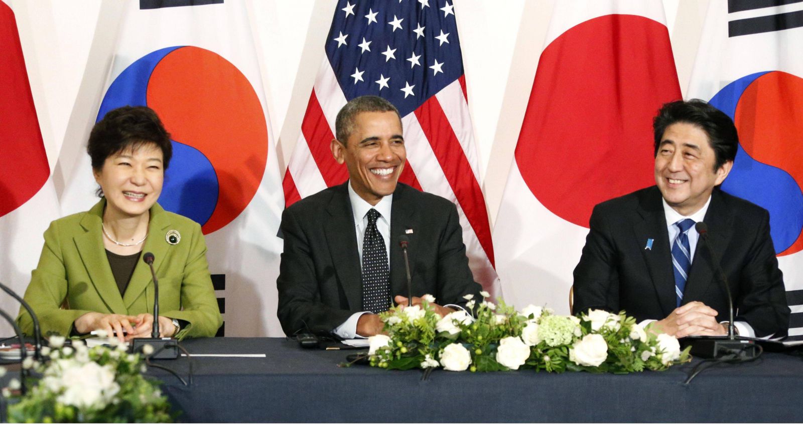 Lãnh đạo ba nước Hàn-Mỹ-Nhật (từ trái qua) trong một cuộc họp ba bên. Ảnh: Yonhap
