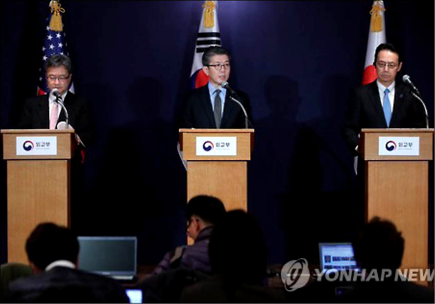 Quan chức đại diện 3 nước Mỹ-Hàn-Nhật trong một cuộc họp 3 bên tại Seoul cuối năm 2016. Ảnh: Yonhap