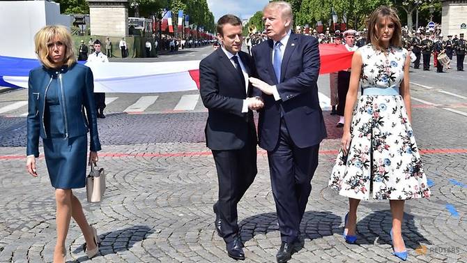 Tổng thống Pháp Emmanuel Macron (bên trái) bắt tay Tổng thống Mỹ Donald Trump tại thủ đô Paris, Pháp. Ảnh: Reuters