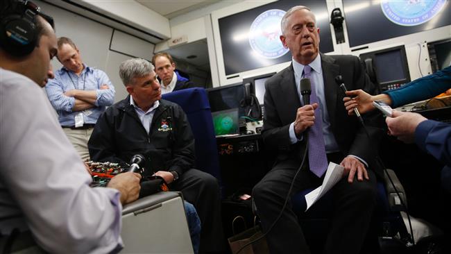 Bộ trưởng Quốc phòng Mỹ James Mattis trả lời phỏng vấn của các phóng viên trong chuyến công du đến Saudi Arabia ngày 18/4/2017. Ảnh: AFP