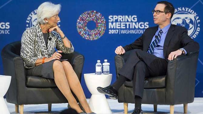 | Tổng giám đốc IMF Christine Lagarde (bên trái) và Bộ trưởng Tài chính Mỹ Steven Mnuchin trong cuộc gặp ngày 22/4. Ảnh: CNA |