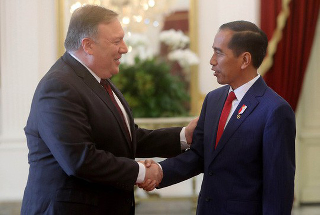 Ngoại trưởng Mỹ Mike Pompeo bắt tay Tổng thống Joko Widodo trong chuyến thăm thủ đô Jakarta - Indonesia hôm 5/8 Ảnh: REUTERS