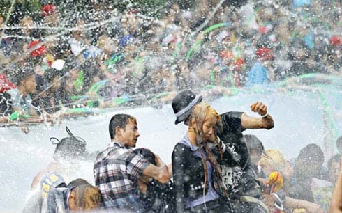 Sau nghi lễ đi chùa cầu bình an là nghi lễ té nước, mọi người cùng đổ ra đường phố, dùng vòi phun, hay xô nước dội lên nhau thay cho lời chúc mừng năm mới. Sau khi bị dội nước lên người họ sẽ đi bộ dưới ánh nắng mặt trời để làm khô quần áo.