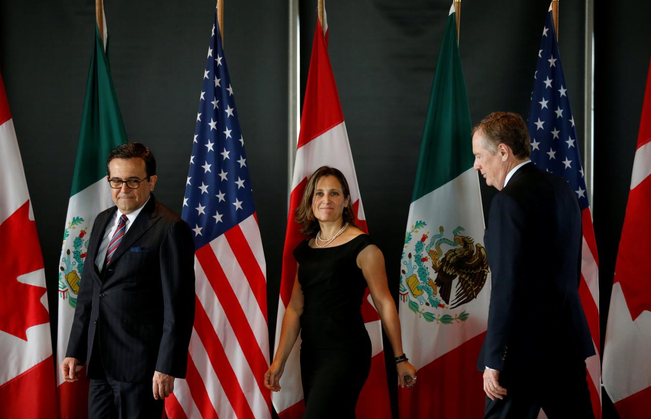 Từ trái sang: Bộ trưởng Kinh tế Mexico Ildefonso Guajardo, Ngoại trưởng Canada Chrystia Freeland và Đại diện Thương mại Mỹ Robert Lighthizer đến một cuộc họp 3 bên trong vòng thứ 3 của các cuộc đàm phán NAFTA tại thủ đô Ottawa, Canada. Ảnh: Reuters
