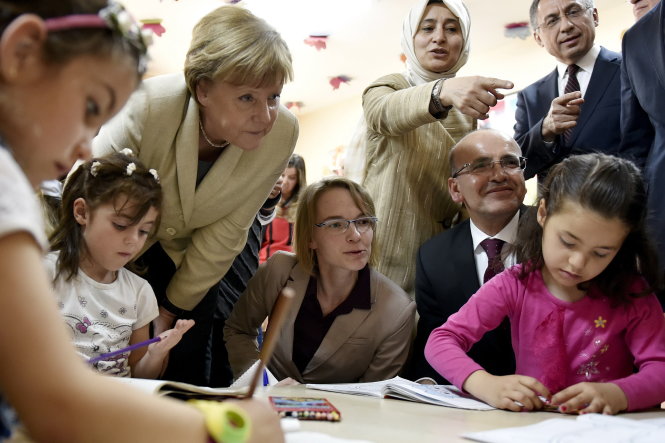Thủ tướng Đức Angela Merkel (thứ ba từ trái sang) đến thăm một điểm giữ trẻ trong trại tị nạn Nizip ở Thổ Nhĩ Kỳ ngày 23/4. Ảnh: Reuters