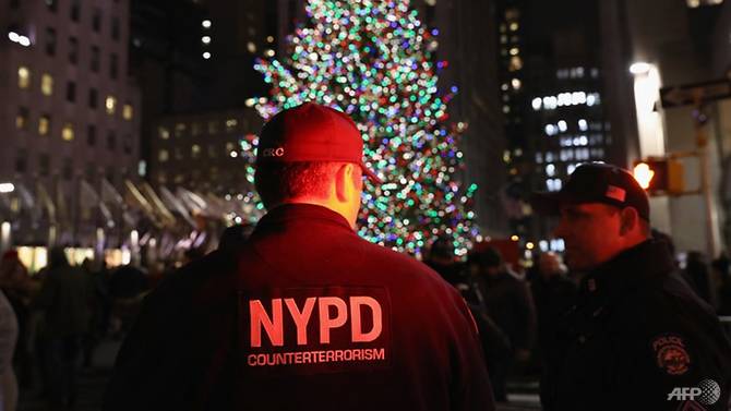 Cảnh sát chống khủng bố đứng canh gác gần cây thông Noel tại Rockefeller Center ở thành phố New York, Mỹ. Ảnh: AFP