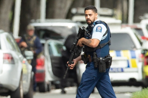 | Cảnh sát New Zealand làm nhiệm vụ gần hiện trường vụ xả súng. Ảnh: SNPA. |