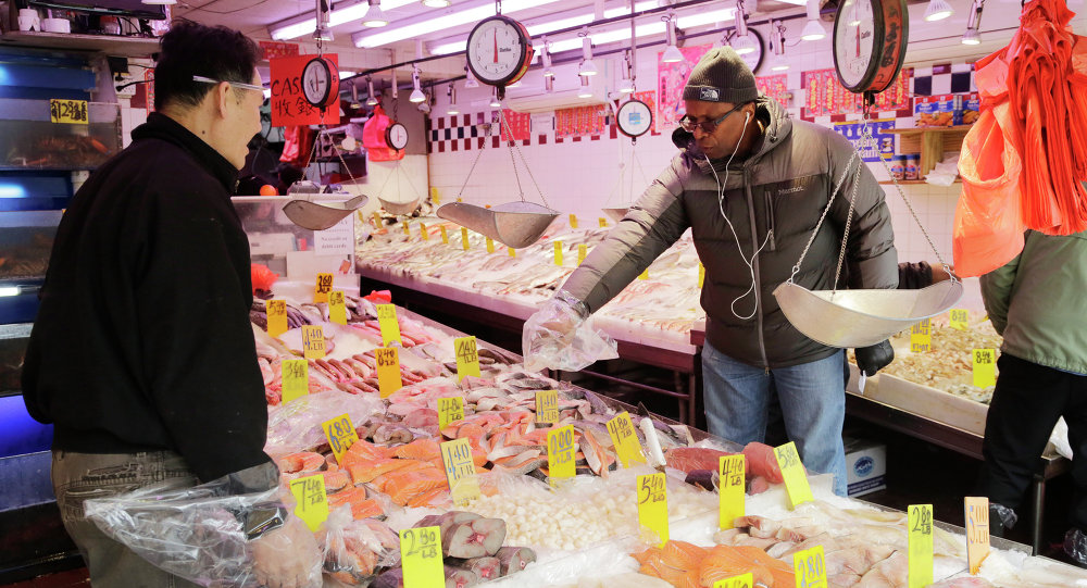 Khách hàng lựa chọn thủy sản tại một khu chợ ở New York, Mỹ. Ảnh: AP