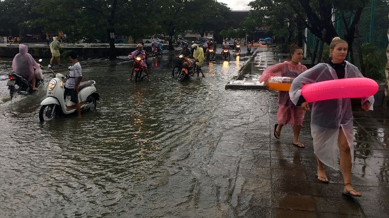Những trận mưa lớn biến đường thành sông, gián đoạn các tuyến đường sắt và nhiều chuyến bay bị trì hoãn, trong đó có đảo Samui, một điểm đến du lịch nổi tiếng.