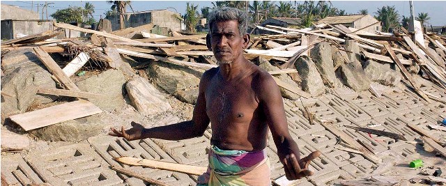 Một người đàn ông đứng bên ngôi nhà mình đã bị phá hủy bởi sóng thần. Moratuwa, thị trấn ven biển ở Tây Nam Sri Lanka, là một trong nhiều khu vực bị tàn phá hoàn toàn bởi trận sóng thần ở Ấn Độ Dương vào ngày 26 tháng 12 năm 2004 (Ảnh: Evan Schneider, UN)