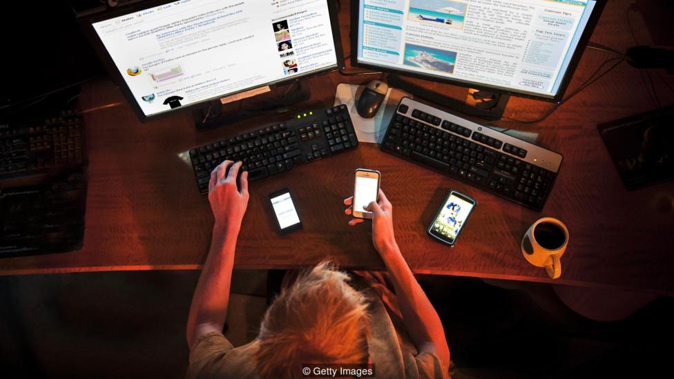 | Hình minh họa một người nghiện mạng xã hội đặc trưng hiện nay, khi vừa online bằng máy tính vừa lướt điện thoại cùng lúc - Ảnh: Getty Images |