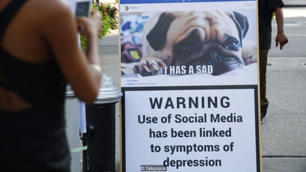 | Một biển quáng cáo của Talkspace với thông điệp "Cảnh báo: sử dụng mạng xã hội có thể dẫn đến các triệu chứng trầm cảm" - Ảnh: Talkspace |