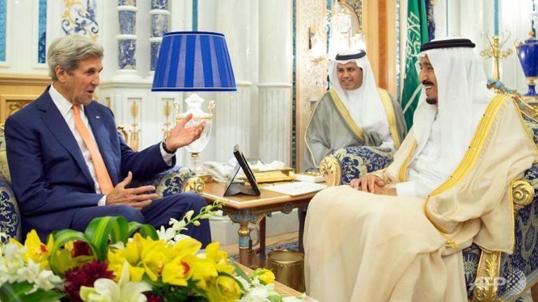 Ngoại trưởng Mỹ John Kerry (trái) trong cuộc gặp Vua Salman bin Abdulaziz của Arab Saudi tại Jeddah. Ảnh: AFP