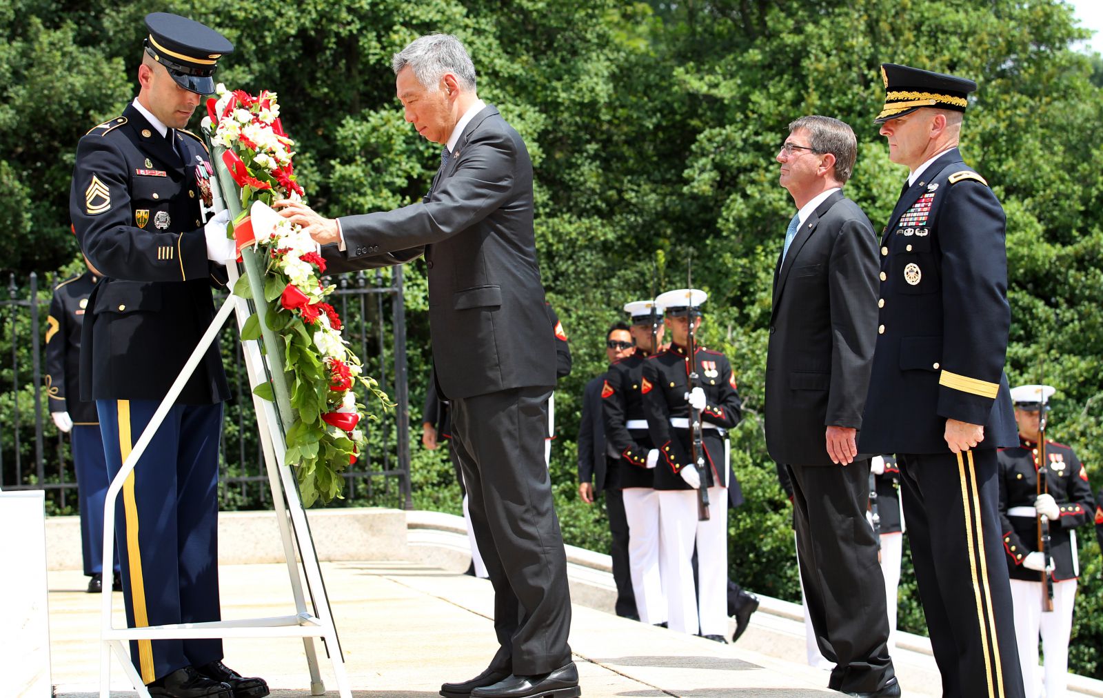 Cũng trong chuyến thăm Mỹ, Thủ tướng Lý Hiển Long ngày hôm qua đến thăm Nghĩa trang Quốc gia Arlington, nơi ông đã đặt vòng hoa tại Mộ Chiến sĩ Vô danh.