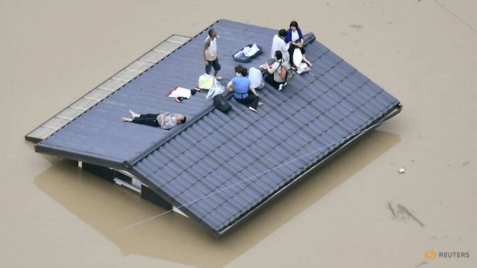 Người dân địa phương chờ được giải cứu trên mái của một ngôi nhà ngập nước lũ ở thành phố Kurashiki, Nhật Bản. Ảnh: Reuters