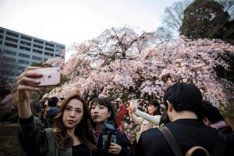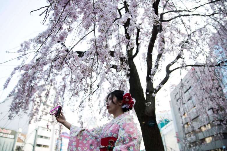 | Chụp ảnh cùng hoa anh đào. Ảnh: AFP |