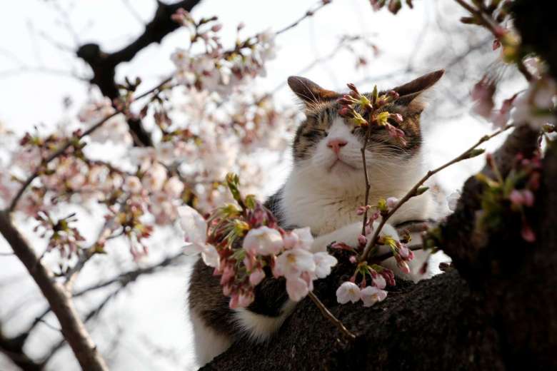 Một con mèo trên cây hoa anh đào ở công viên Tokyo. Ảnh: Reuters