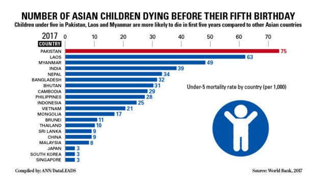 Cụ thể, trẻ em ở Nam Á phải đối mặt với nguy cơ tử vong cao nhất trước khi trẻ bắt đầu bước vào tuổi thứ 5, với Paskistan là quốc gia đặc biệt nghiêm trọng khi cứ 1.000 trẻ sẽ có đến 75 trường hợp tử vong sớm. Trong đó nguyên nhân chính dẫn đến tình trạng này là do trẻ em mắc bệnh viêm phổi, tiêu chảy và sốt rét.