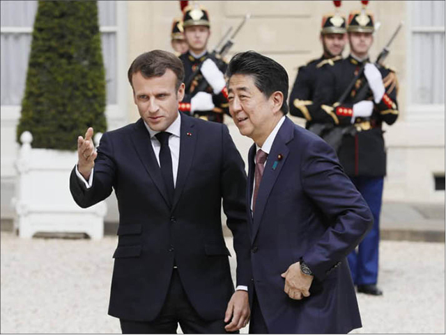 Tổng thống Pháp Emmanuel Macron và Thủ tướng Nhật Bản Shinzo Abe trước buổi họp báo chung ở Paris. Ảnh: Japan Times