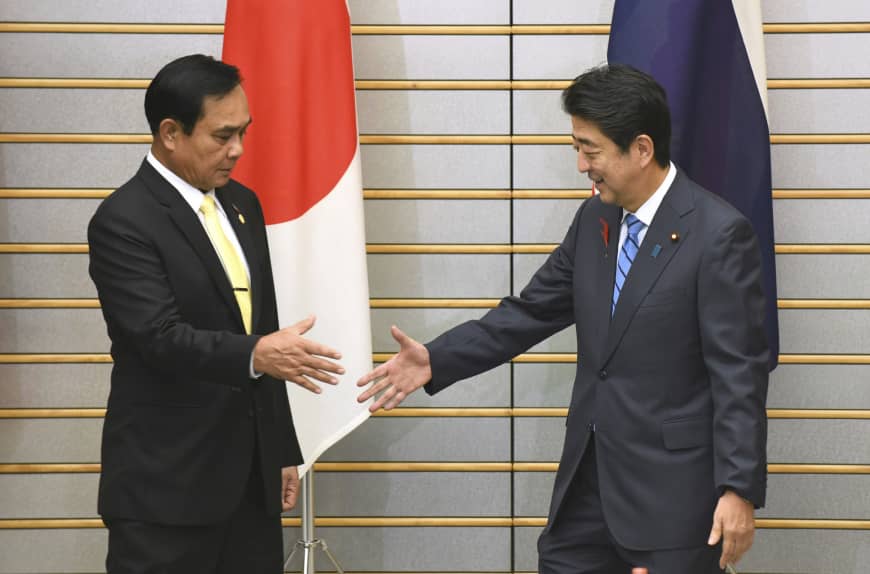 Thủ tướng Nhật Bản Shinzo Abe (phải) và người đồng cấp phía Thái Lan Prayuth Chan-ocha . Ảnh: Japan Times