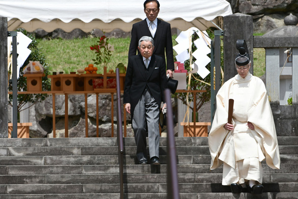 Nhật hoàng Akihito thăm lăng tẩm của cha ông là cố Nhật hoàng Hirohito ở Hachioji, tây Tokyo ngày 23/4/2019 - Ảnh: AFP
