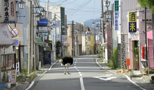 | Chú đà điểu đi lại trên một khu phố ở Fukushima. Ảnh: AP |