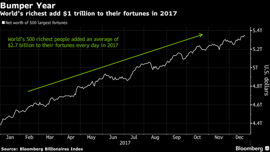 Trong năm 2017, 500 người giàu nhất thế giới kiếm được gần 1.000 tỉ USD. Ảnh: Bloomberg