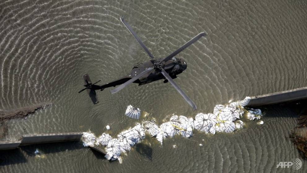 Trực thăng thả bao cát xuống đoan đê vỡ ở bang New Orleans, Mỹ năm 2005. Ảnh: AFP