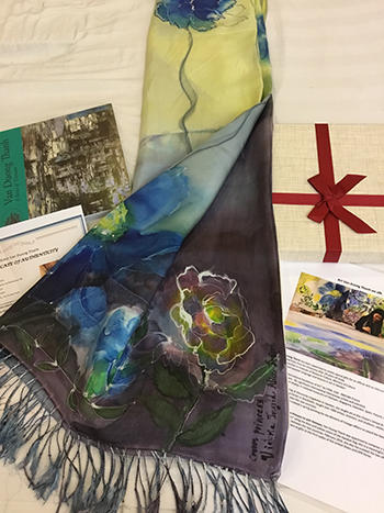 Chiếc khăn là một món quà đặc biệt được bởi trên mặt khăn là một bức tranh thiên nhiên Thụy Điển được nữ họa sĩ Văn Dương Thành, người từng có thời gian gắn bó và am hiểu về vương quốc Bắc Âu, vẽ.