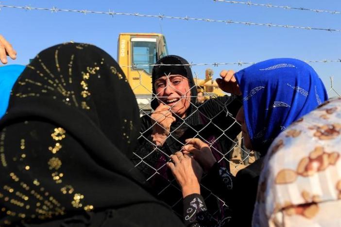 Một phụ nữ Iraq bật khóc khi gặp lại người thân qua hàng rào trại tị nạn Al-Khazer ngày 4/11/2016. Ảnh: Reuters