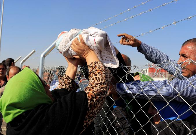 Nâng cao một bé gái sơ sinh cho người thân bên hàng rào được nhìn thấy. Ảnh: Reuters.