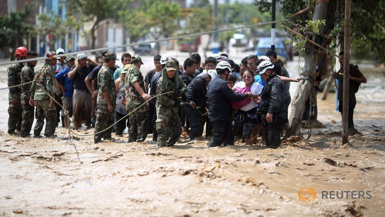 Cảnh sát giúp người dân băng qua một con đường nước lũ chảy xiết ở Peru. Ảnh: Reuters