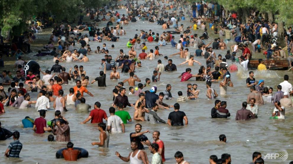 Nhiều người dân tắm trên một dòng kênh để đối phó với cơn nóng ở Pakistan. Ảnh: CBSNews