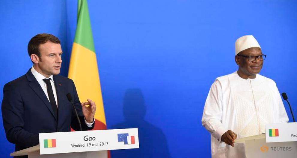 Tổng thống Pháp Emmanuel Macron trong một cuộc họp báo với người đồng cấp Mali Ibrahim Boubacar Keita ở thành phố Gao, phía bắc Mali ngày 19/5. Ảnh: Reuters