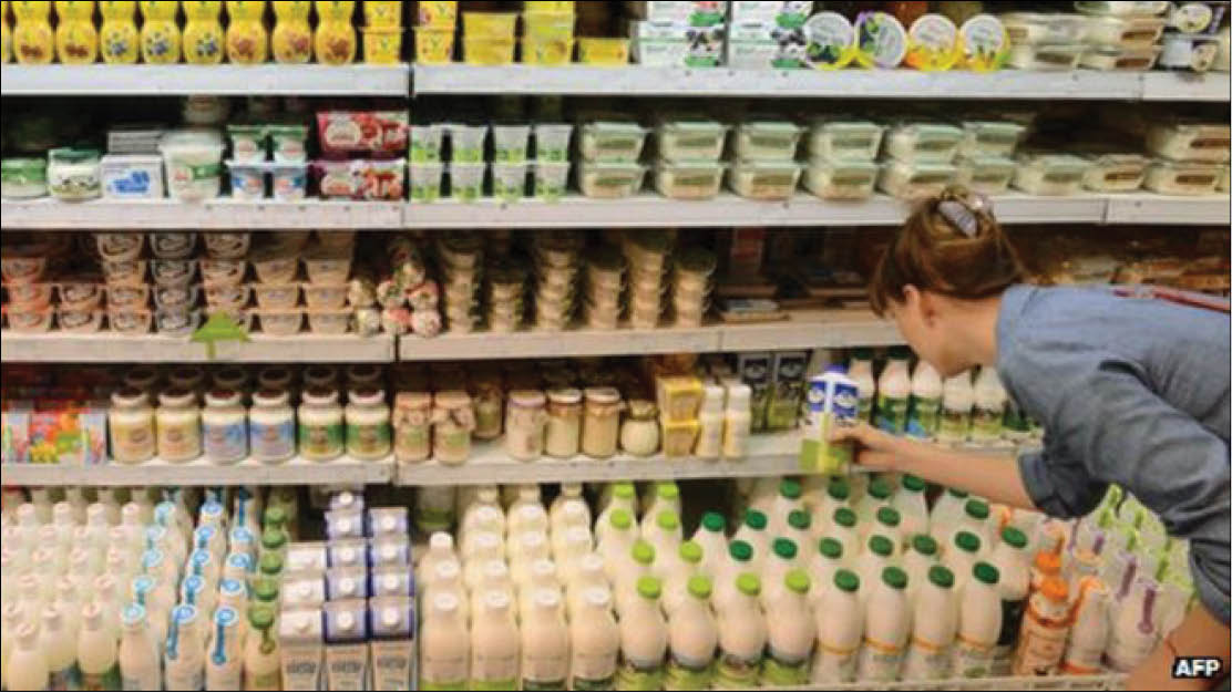 Các mặt hàng sữa trong một siêu thị tại thủ đô Moscow, Nga. Ảnh: AFP