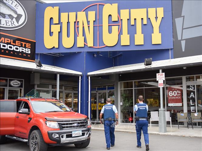 Cảnh sát gác bên ngoài một cửa hàng bán súng ở Christchurch, New Zealand, ngày 18/3/2019. Ảnh: THX/TTXVN