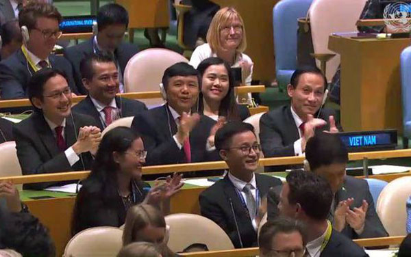 Khán phòng vỗ tay chúc mừng phái đoàn Việt Nam tại Liên Hiệp quốc (Ảnh chụp màn hình)