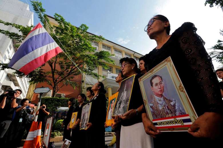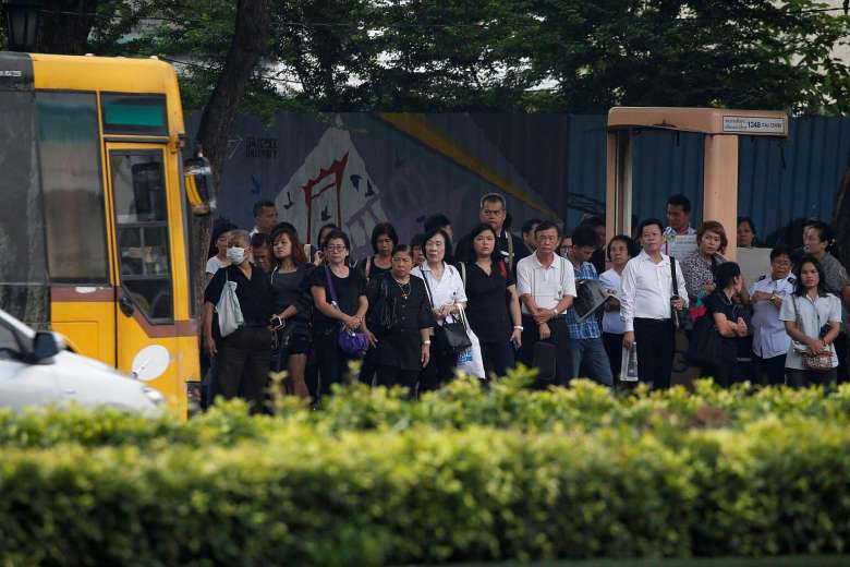 Nhiều người dân trong trang phục đen và trắng đứng trước một trạm xe buýt ở thủ đô Bangkok hôm 14/10. Ảnh: Reuters