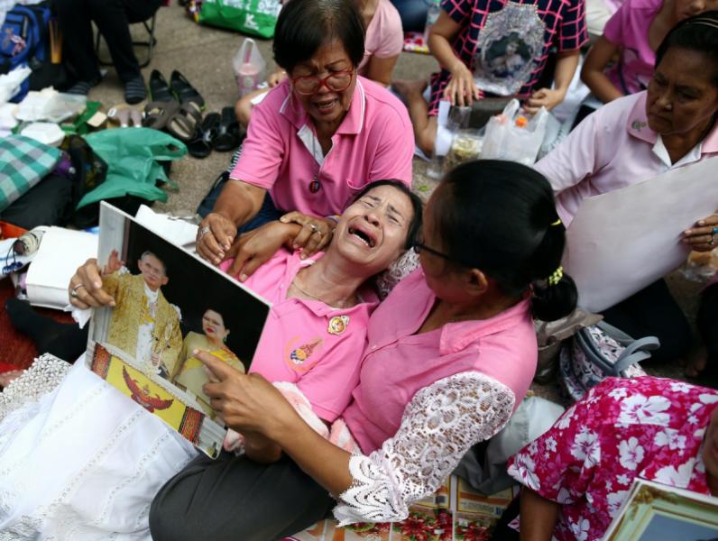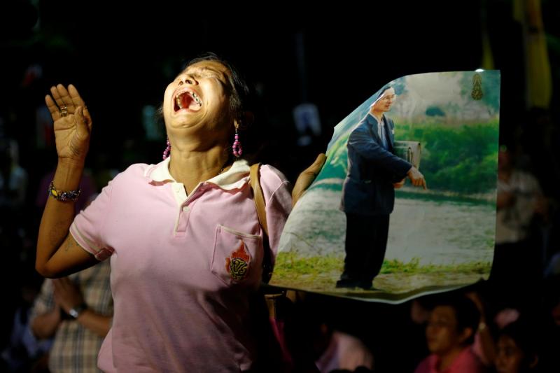 Người dân Thái Lan đau buồn ôm bức chân dung của cố Quốc vương Bhumibol Adulyadej trước bệnh viện Siriraj ở thủ đô Bangkok sáng 14/10. Ảnh: Reuters
