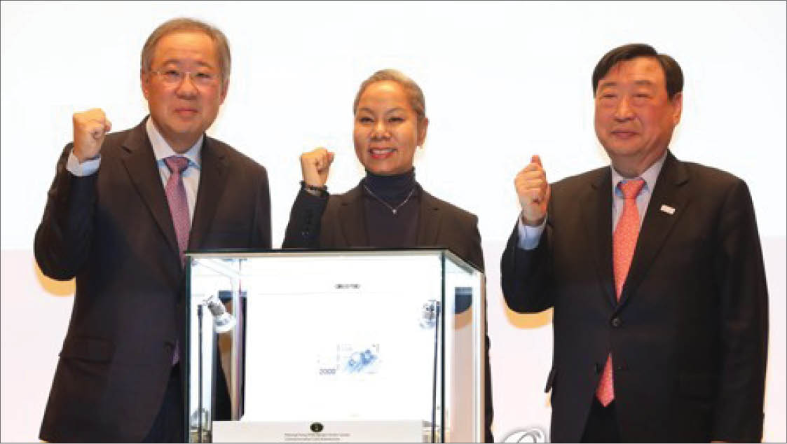 Chủ tịch tập đoàn Poongsan Ryu Jin, ca sĩ Insooni và trưởng ban POCOG, ông Lee Hee-beom chụp ảnh với bộ sưu tập tiền xu. Ảnh: Yonhap