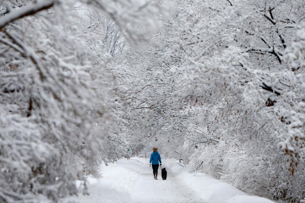 Ngày 4/1: Người phụ nữ dắt chú chó nhỏ bước đi trên con đường phủ đầy tuyết trắng tuyệt đẹp cạnh kênh đào Rideau ở Ottawa, Ontario, Canada. Ảnh: REUTERS / Chris Wattie