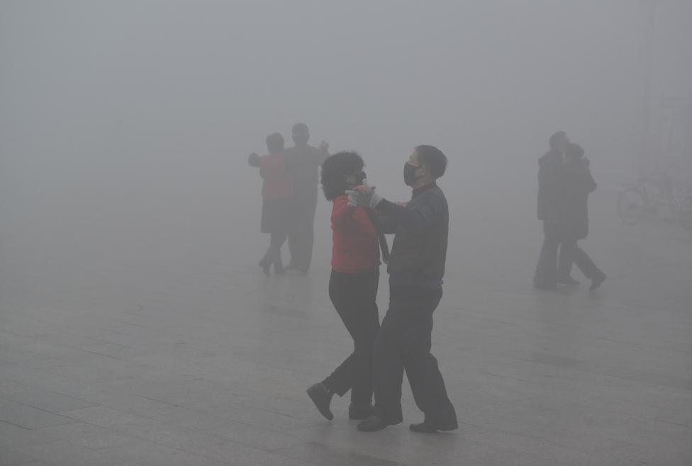 Ngày 3/1: Người dân phải đeo mặt nạ trong khi khiêu vũ tại một quảng trường chìm trong khói mù nghiêm trọng trong một ngày ô nhiễm tại Phụ Dương, tỉnh An Huy, Trung Quốc. Ảnh: China Daily / REUTERS.