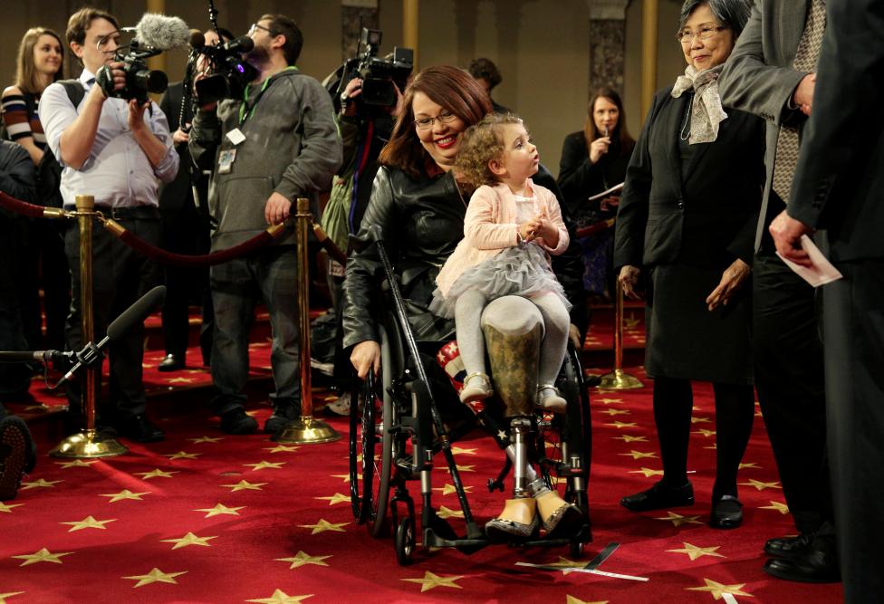 Ngày 3/1: Thượng nghị sĩ Tammy Duckworth (ngồi xe lăn) mang theo cô con gái Abigail trong buổi tuyên thệ với Phó Tổng thống Hoa Kỳ Joe Biden vào ngày khai mạc Đại hội 115 ở Capitol Hill, Washington. Ảnh: REUTERS / Joshua Roberts