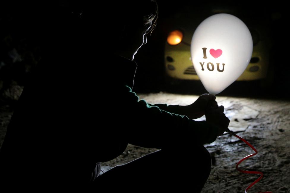 Ngày 1/1: Một nhà hoạt động cầm quả bóng trước khi thả nó về phía thành phố Damascus vào ngày đầu tiên của thỏa thuận ngừng bắn, và cũng để gửi đi một thông điệp rằng, các hoạt động dân sự sẽ tiếp tục được diễn ra ở ngoại ô Damascus, Syria. Ảnh REUTERS / Bassam Khabieh.