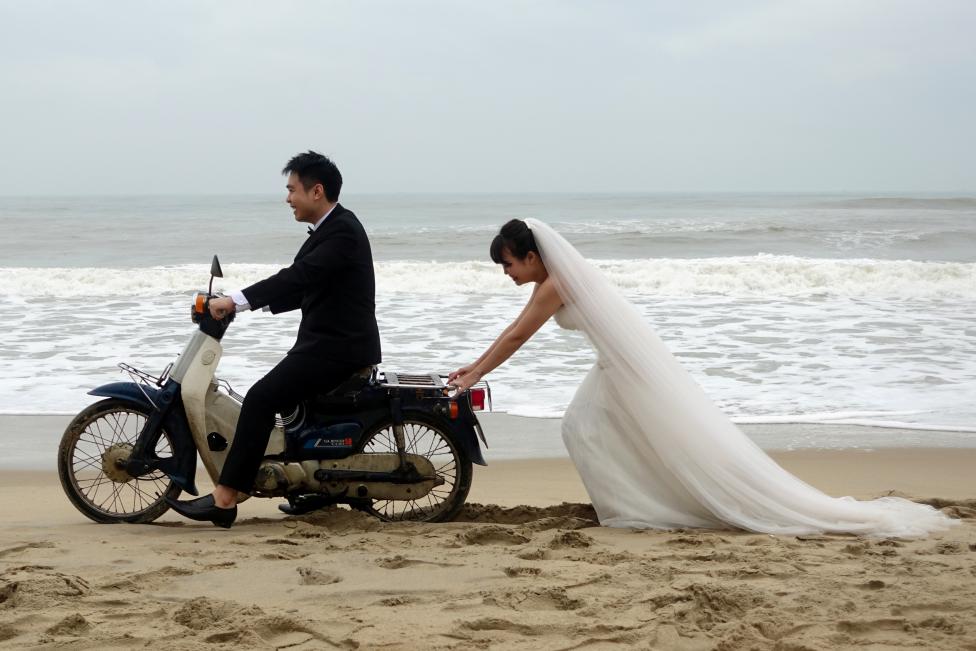 1. Ngày 11/12: Bức ảnh ngộ nghĩnh chụp cảnh một cô dâu Việt Nam đang đẩy xe cho chú rể trong một buổi chụp ảnh cưới tại Bãi biển An Bằng ở Hội An, Việt Nam. Ảnh: REUTERS / Stringer
