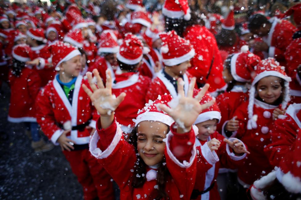 2. Ngày 12/12: Trẻ em trong trang phục Ông già Noel tham gia một cuộc diễu hành được tổ chức để quyên thực phẩm cho người dân nghèo tại Lisbon, Bồ Đào Nha. Ảnh: REUTERS / Rafael Marchante