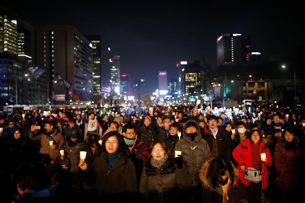 Hàng người tham dự một cuộc biểu tình ở trung tâm Seoul, Hàn Quốc kêu gọi Tổng thống nước này Park Geun-hye từ chức, sau vụ bê bối làm rung chuyển chính trường đất nước. REUTERS / Kim Hong-Ji