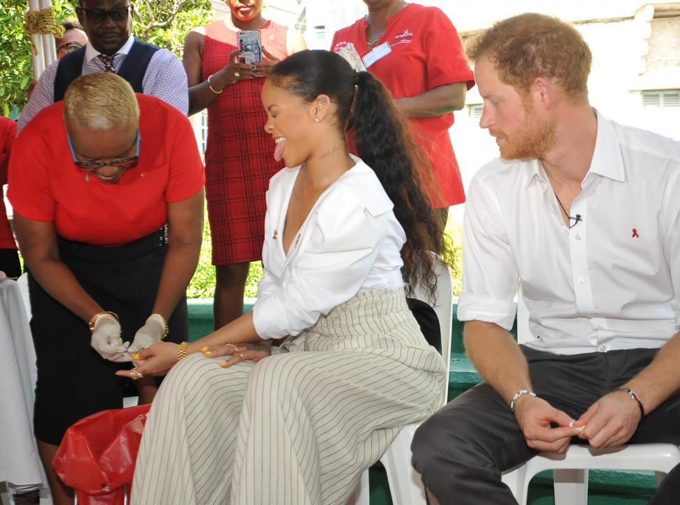 Hoàng tử Harry của Vương quốc Anh và ca sĩ nổi tiếng Rihanna tiến hành một xét nghiệm HIV để giúp nâng cao nhận thức cộng đồng trong ngày Thế giới phòng chống AIDS tại Bridgetown, Barbados. REUTERS / Antonio Miller