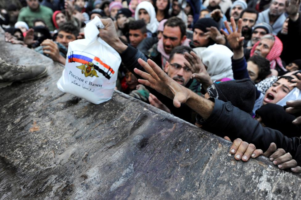 Người dân Syria vừa được sơ tán từ phía đông Aleppo được tiếp cận với nguồn lương thực viện trợ của Nga ở khu vực Jibreen, Syria. Trên các túi đựng lương thực có hình quốc kỳ Syria và Nga, cùng dòng chữ bằng tiếng Ả Rập mang nghĩa "Nga luôn ở bên các bạn". REUTERS / Omar Sanadiki
